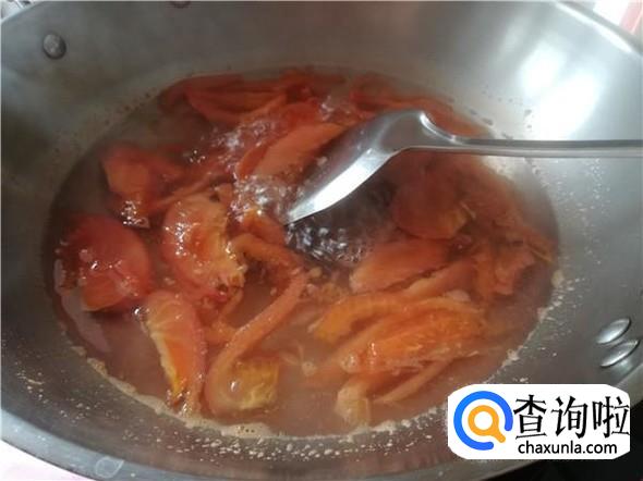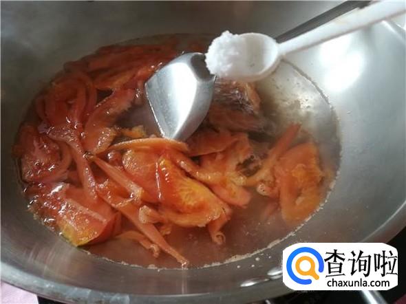 西红柿煮了两分钟后,用锅铲把西红柿摁散,也不用摁得太散,不喜欢吃西红柿皮的朋友可以趁机把西红柿皮挑起来。西红柿摁散之后,加入少量盐