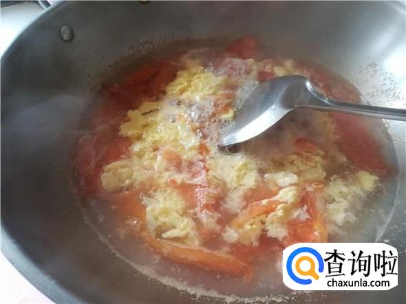 水煮开之后,倒入切好的西红柿,注意要轻轻倒,不要太用力,以防烫伤。