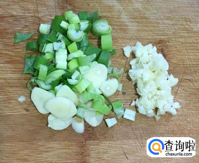 葱、蒜剥去外皮清洗干净分别切成葱花、蒜片。把大蒜另一半切成蒜末备好