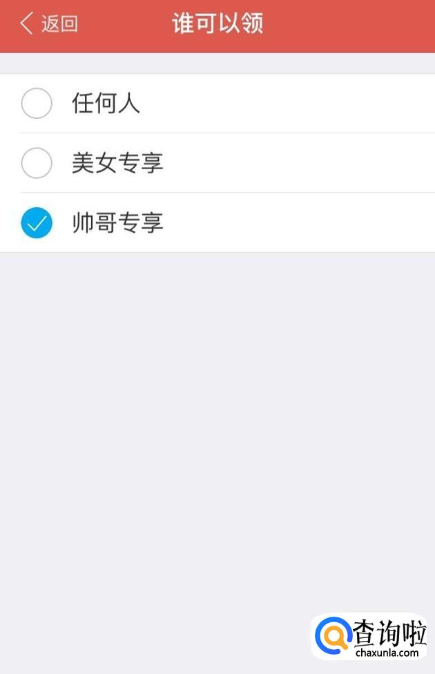 点击发红包之后会有提醒,点击选择帅哥专享,就可以发送帅哥专享红包了。