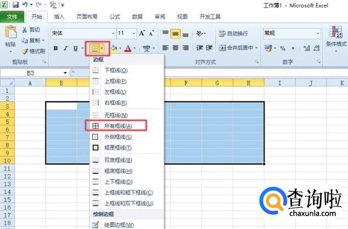 然后我们点击边框按钮边上的下拉箭头,弹出的界面,我们点击所有边框;