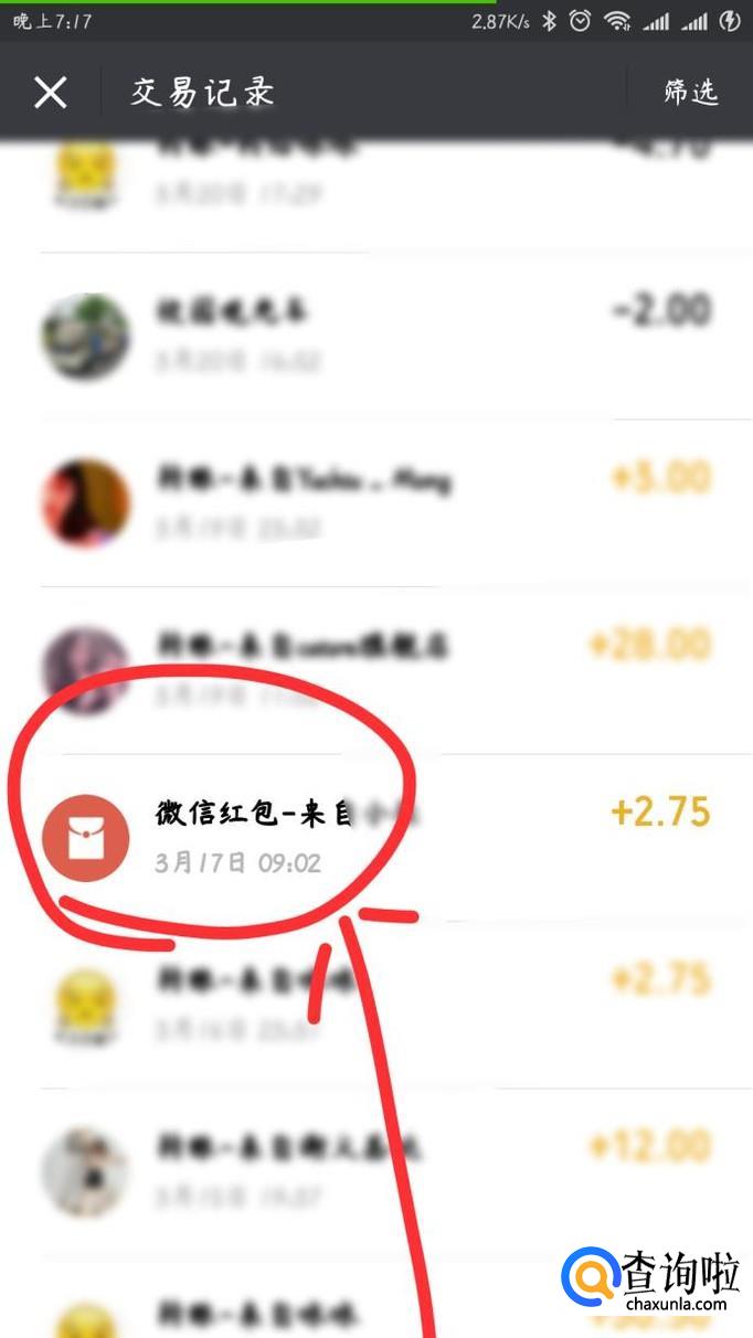 点击之后进入下一个界面,会出现你所点击的红包的详细交易记录,然后点击上面的“查看”字样,又进入下一个页面。你将会看到该界面的右上角有“红包记录”的字样,然后点击,又进入下一个界面。