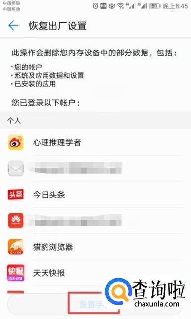 弹出的界面,我们需要等待一段时间,然后我们点击重置手机,之后就会进入恢复出厂设置了。