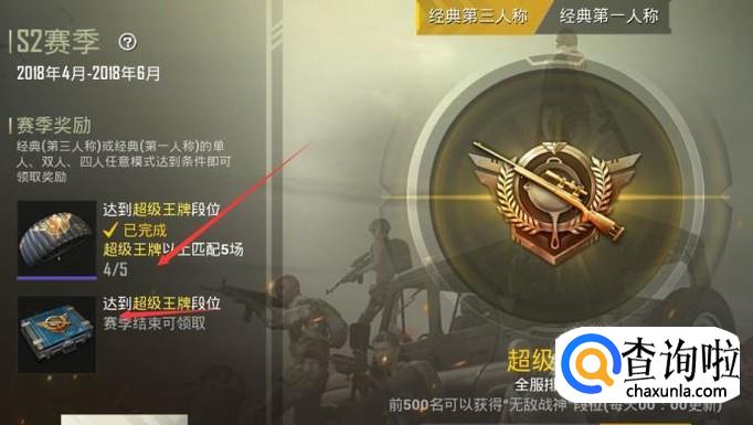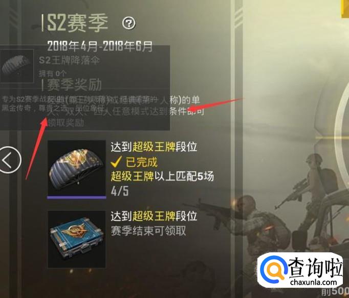 如图,上面说的很清楚,你达到段位之后你要完成五场的比赛你会有降落伞的奖励,完成就可以在这个界面点击领取就可以了。