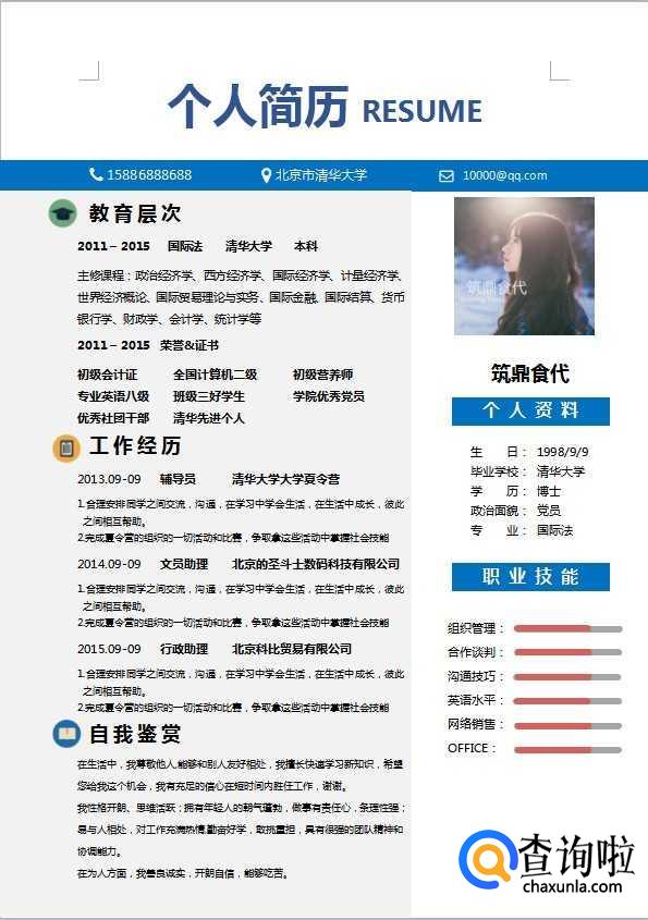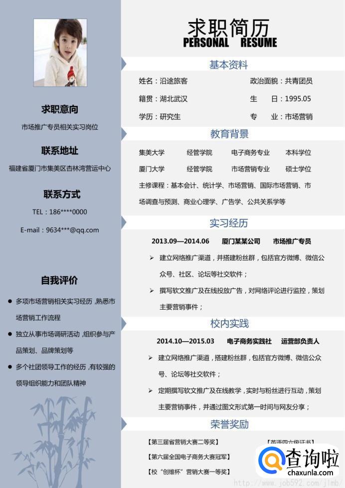 标题最好不用《个人简历》,建议用《XXX的个人简历》。字体别弄太大~个人简历就是向HR表现自己的第一个舞台,标题太大了占的位置多,无形中减小了你表现的舞台。用上自己的名字也有原因:简历最重要的作用就是为了给HR留下最深刻的印象,这样HR在把所有简历看完后想把觉得合适的人挑出来的时候,会更容易找到你。