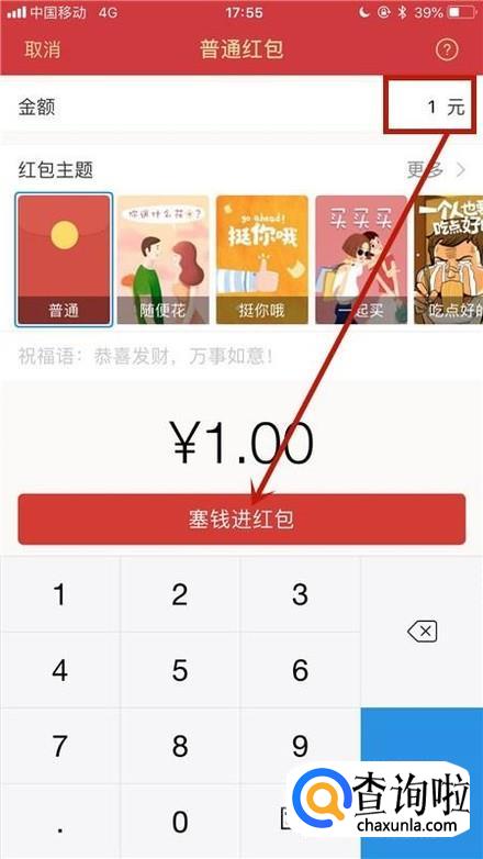 然后输入你要的红包金额,并点击塞钱进红包,如下图所示。