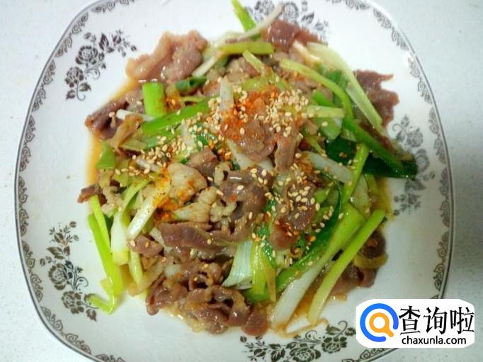 葱丝稍翻炒一下,随即倒入调和好的料汁,稍翻炒至羊肉卷沾满料汁即可,关火出勺。