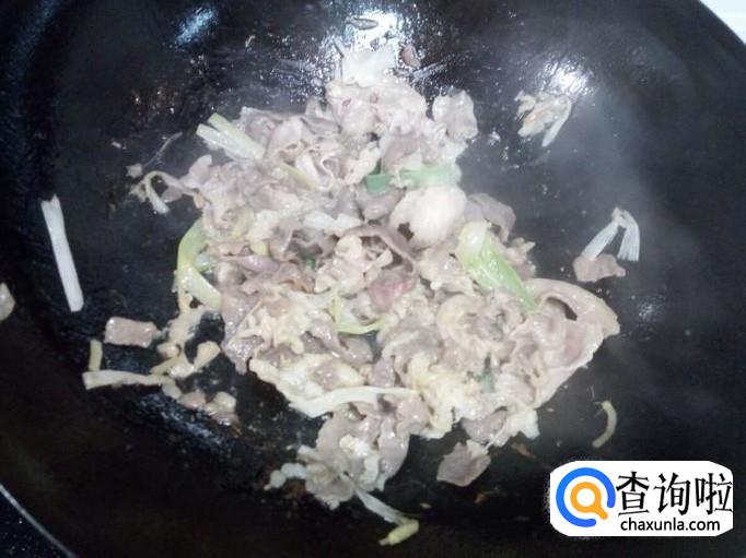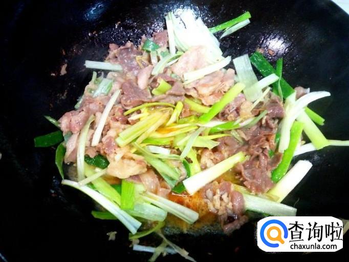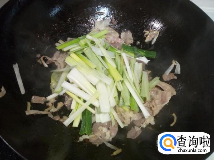 炒至羊肉卷颜色发表,把剩余的另一部分葱丝放入锅中,快速翻炒。