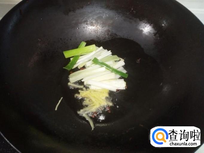 锅内放入少量的油加热,油热后放入花椒,姜,放入一少部分切好的葱丝,爆锅。
