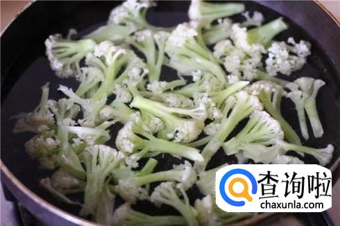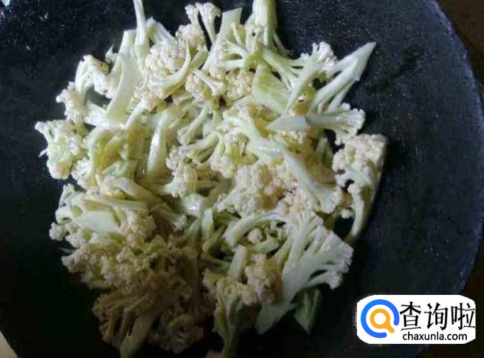 然后往锅中加入适量的调和油,倒入花菜翻炒两分钟。