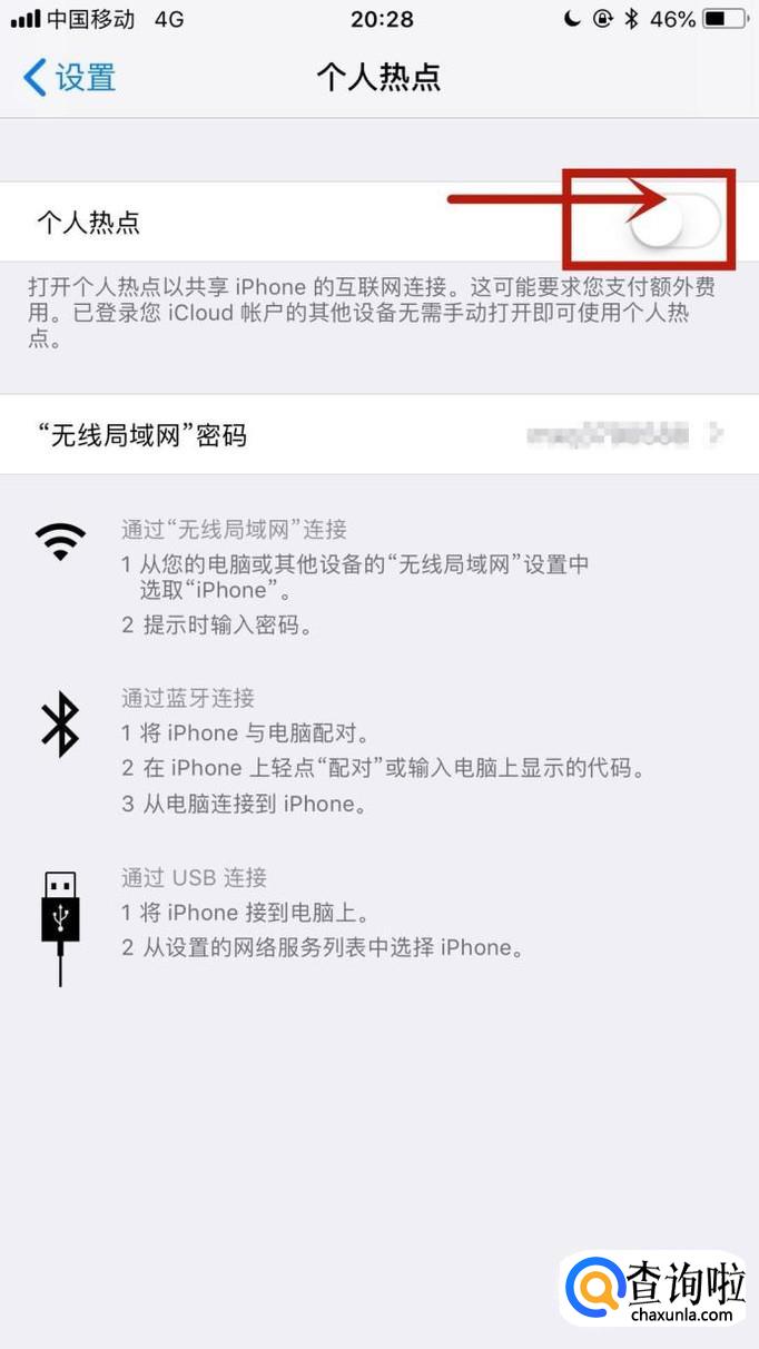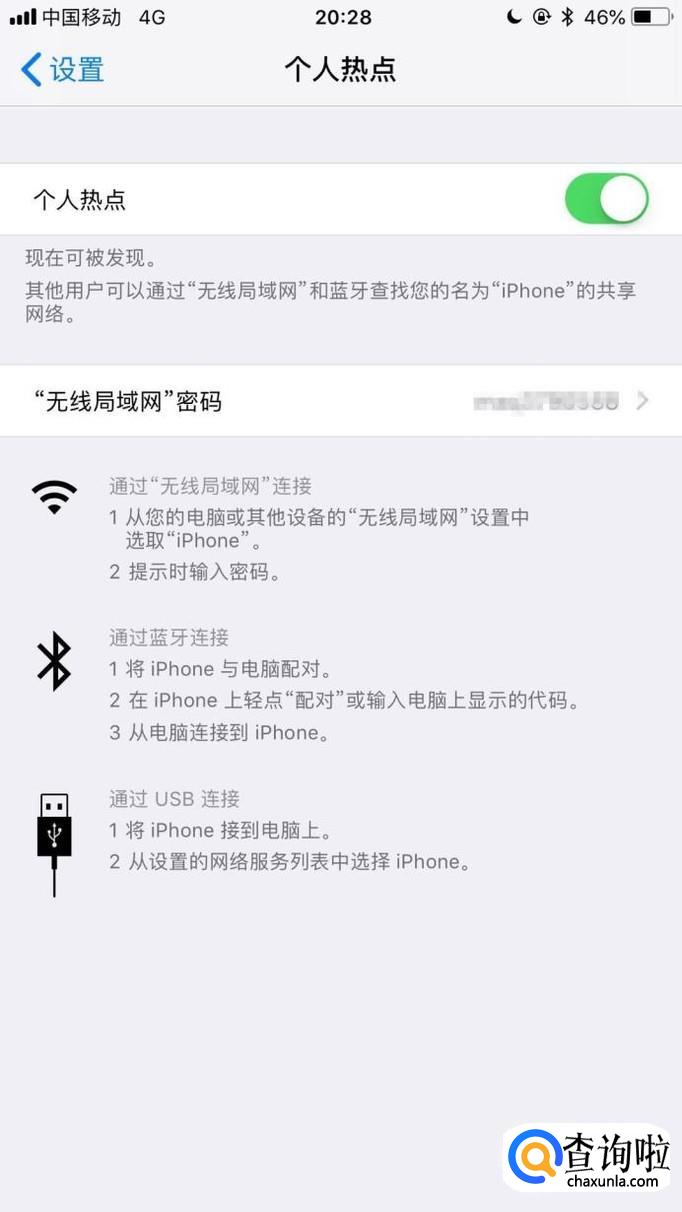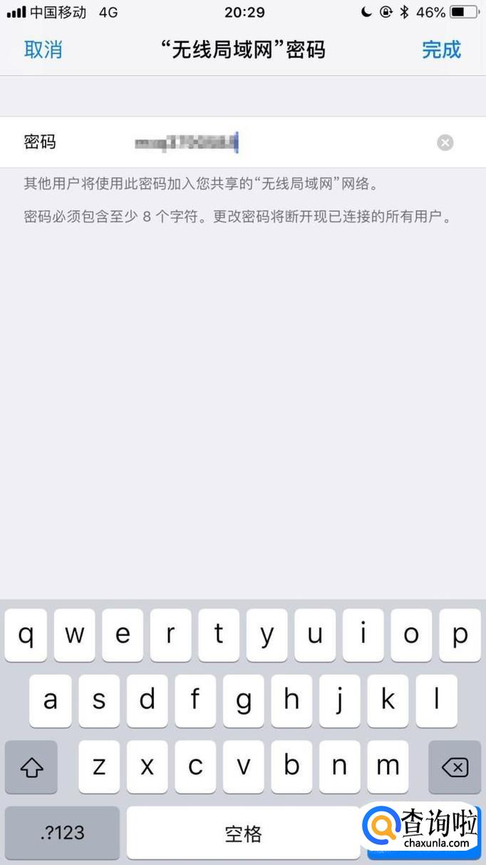 最后输入你的密码并点击完成就可以了。这时候对方只要打开WiFi收索到我们的个人热点,之后输入正确的密码,就能够使用我们的个人流量了。