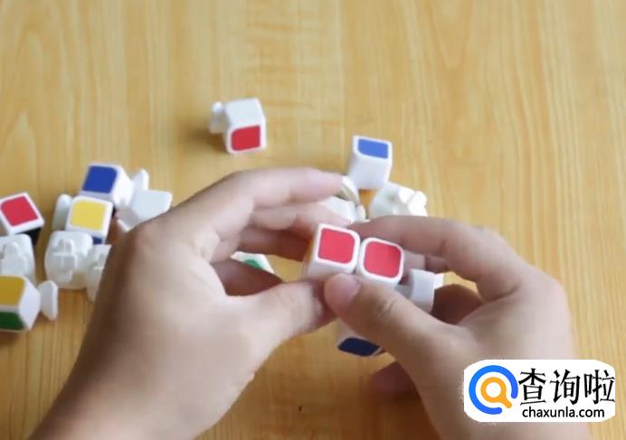 拼装玩中心块后,拼装棱块,在魔方拆下来的小方块中,找只有两个面有颜色的小方块。