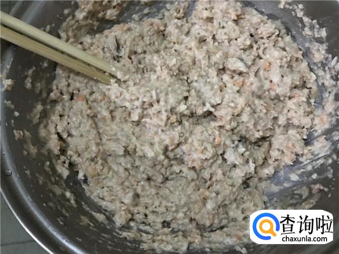 搅拌均匀。接着将猪肉洗好,切成块状,然后放入绞肉机中绞碎,接着倒出来,然后和红萝卜、香菇、蒜头和地瓜粉,放入适量的水,再加入盐、鸡精、花椒粉,搅拌均匀即可。