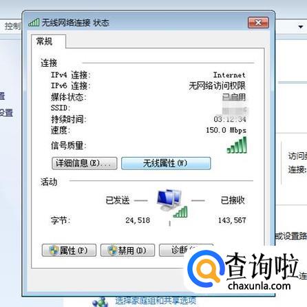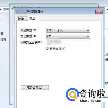 在这个界面里点击“无线属性”,然后在无线属性里点上边的“安全”,就会看到下面的“网络安全密钥”,默认是黑色圆点隐藏的,只要点一下“显示字符”,就可以看到当前的无线密码了。
