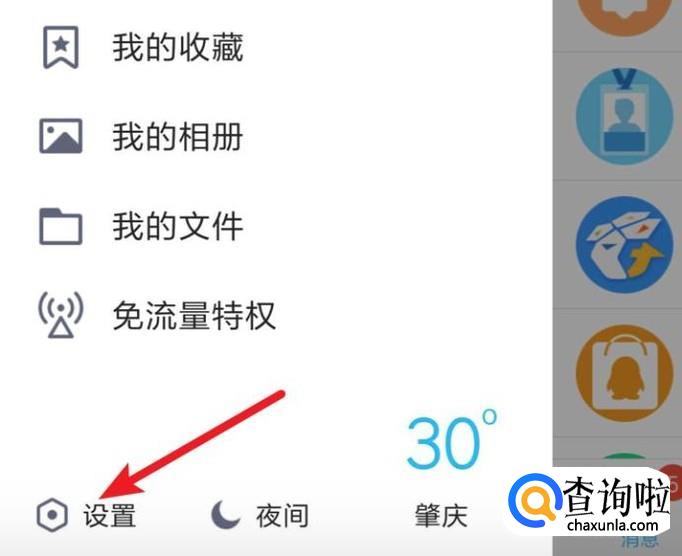 首先打开手机上的QQ,打开侧栏,点击‘设置’。