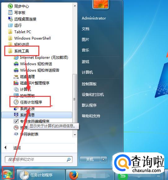单击电脑左下角的“开始”菜单,然后所有程序中找到“系统工具”,单击系统工具下的“任务计划程序”。