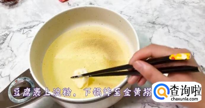 豆腐裹上淀粉,下锅炸至金黄后捞出。