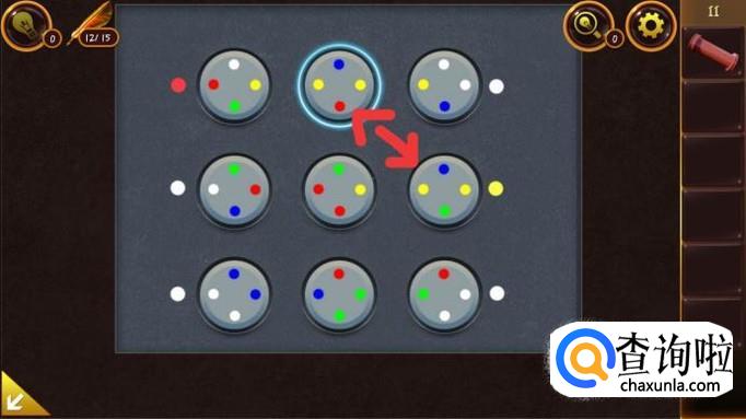 将电线放在中间的机器处,通电后按图示,将两个按钮交换,使按钮通过原点颜色相连,打开机器。