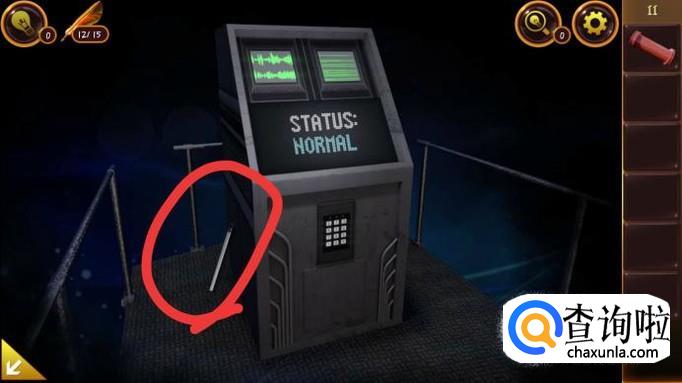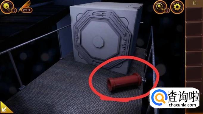 首先点击最右边的机器处,得到一根管道。点击右边机器旁边的电线处,得到一截电线。点击中间的机器,在旁边获得一根铁棍。