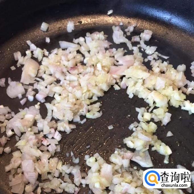 用橄榄油将葱和大蒜放入锅中火煮,直到葱变软为止。被搁置起来。烤茄子切碎