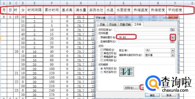 如图所示,出现页面设置面板,在顶端标题行处,点击右侧图标,然后选中标题行,设置完成后,点击“打印预览”。