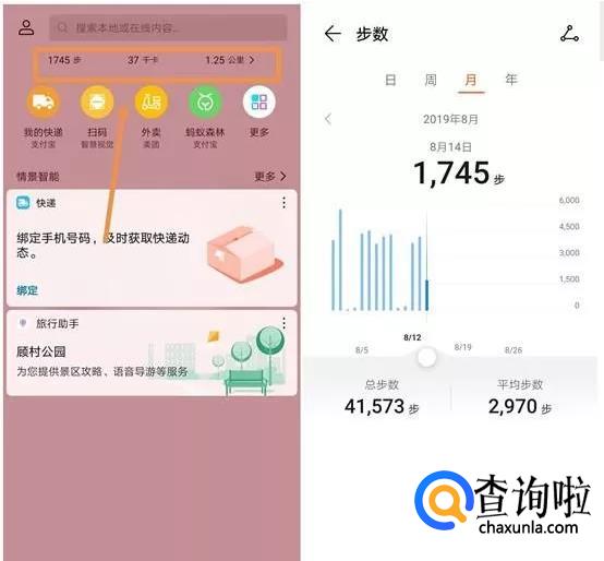 在华为手机“负一屏”搜索栏的下方。有一个步数记录,在这我们能够看到,今天我们走了多少步路,多少公里,消耗了多少卡路里,如果你点击这一栏,进去“运动”界面还可以了解更多关于你运动方面的信息。
