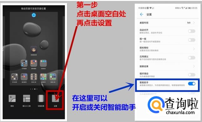 手指长按桌面空白处,在弹出的菜单选择“设置”,然后进入设置菜单就可以看到智能助手,这里可以开启或关闭智能助手。