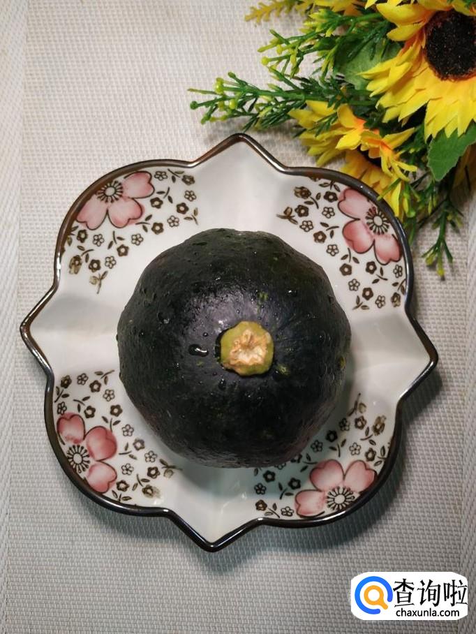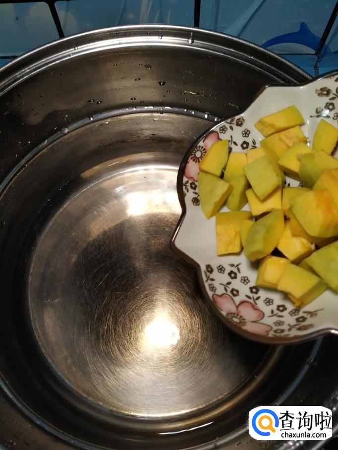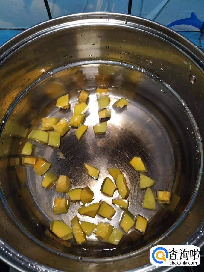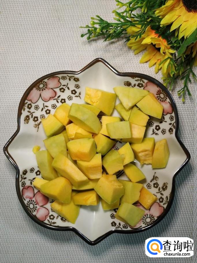 准备一个小南瓜,洗净后,去皮,再掏去瓤,切成块,放入盘中备用。注意,南瓜块儿切得稍微小一些,这样更容易熟。