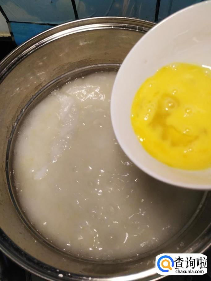 烧开后,碗中打入一个鸡蛋,用筷子打散,趁热淋入锅中。
