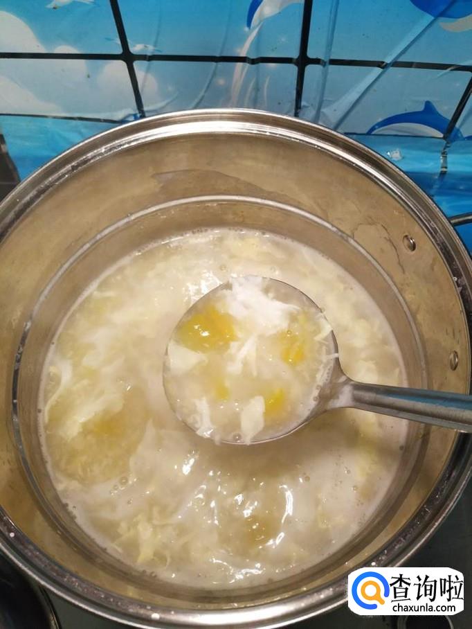 用勺子迅速搅拌,鸡蛋液很快就变成鸡蛋花,飘在锅里了。