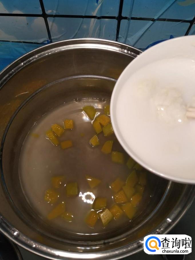 锅中烧开水,水开后,将南瓜块倒入锅中,煮十分钟左右,南瓜很快就熟了。注意,水的量,不要放得太多,后面涮面筋的时候,还要加入很多面糊。
