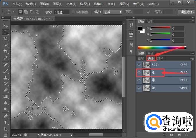 将右边的面板切换为“通道”,然后鼠标单击如图所示的“红色”,同时用手指按ctrl键。