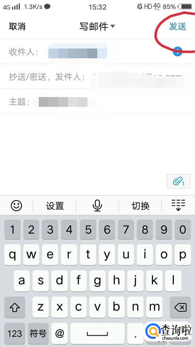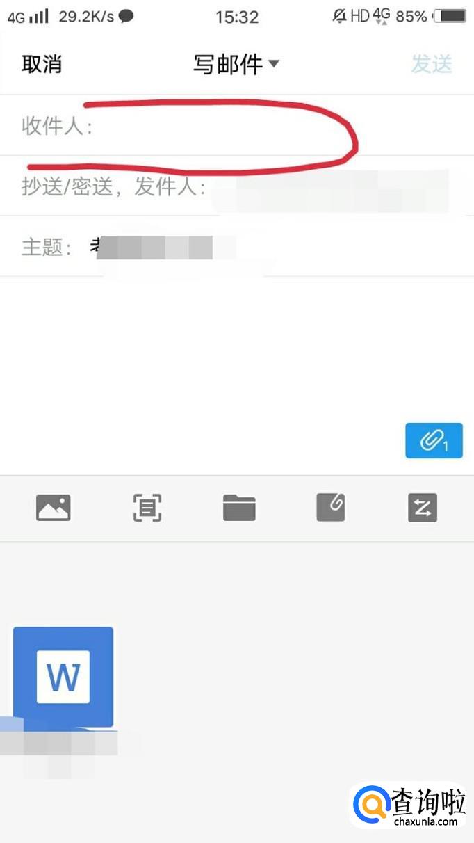 添加收件人后点击右上角的发送,这样就把文件发送到邮箱里了。