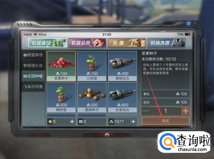 选中要购买的种子后再设置好购买的数量,之后再点击【购买】按键。