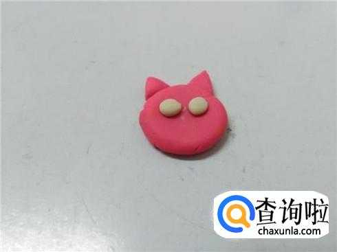 用粉色捏两个三角形,粘在猫头上,当做两个耳朵。