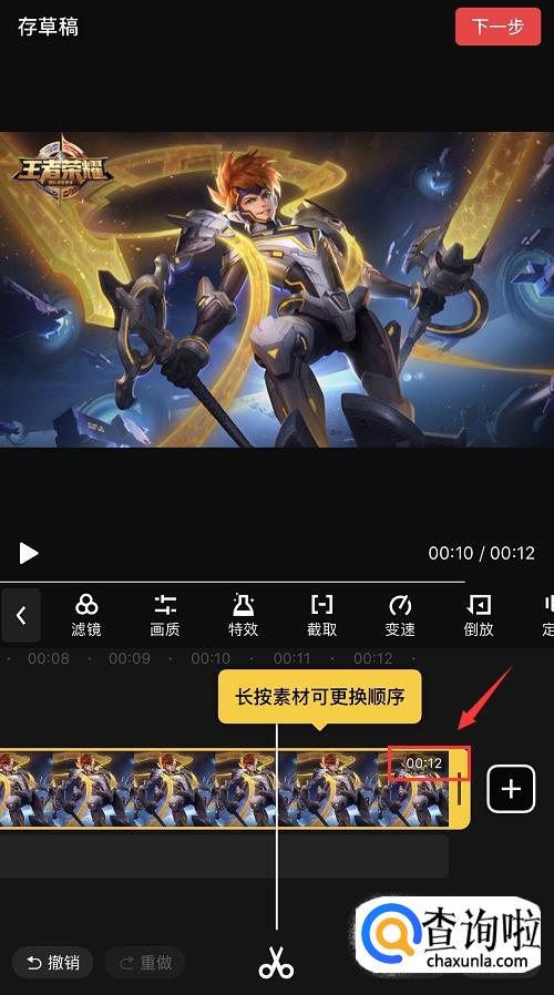 选好后进入编辑页面,点击素材,将其拖动至12秒的位置。