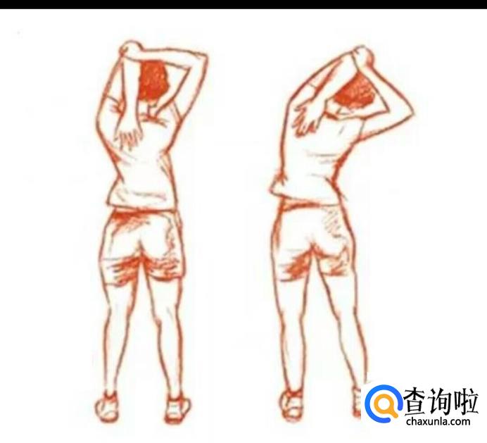 一只手朝头上伸直,弯曲手肘,手掌触碰肩胛骨,另一只手握住手肘部位并往一侧拉,身体同时向相同方向倾斜,左右交替进行。