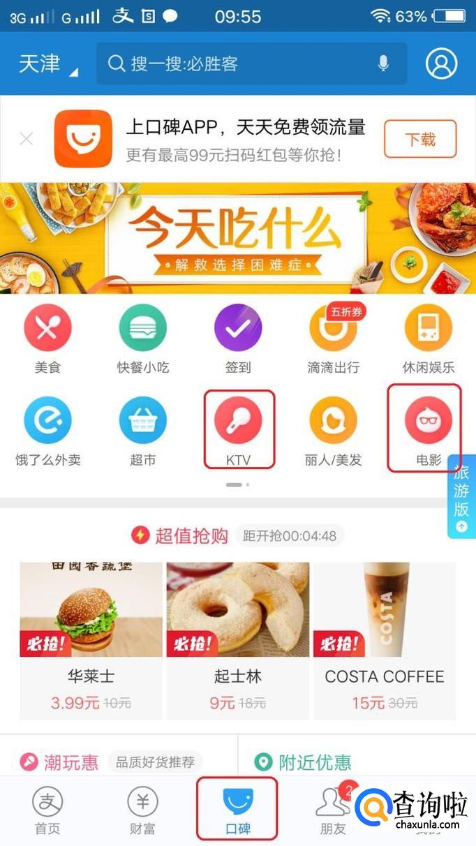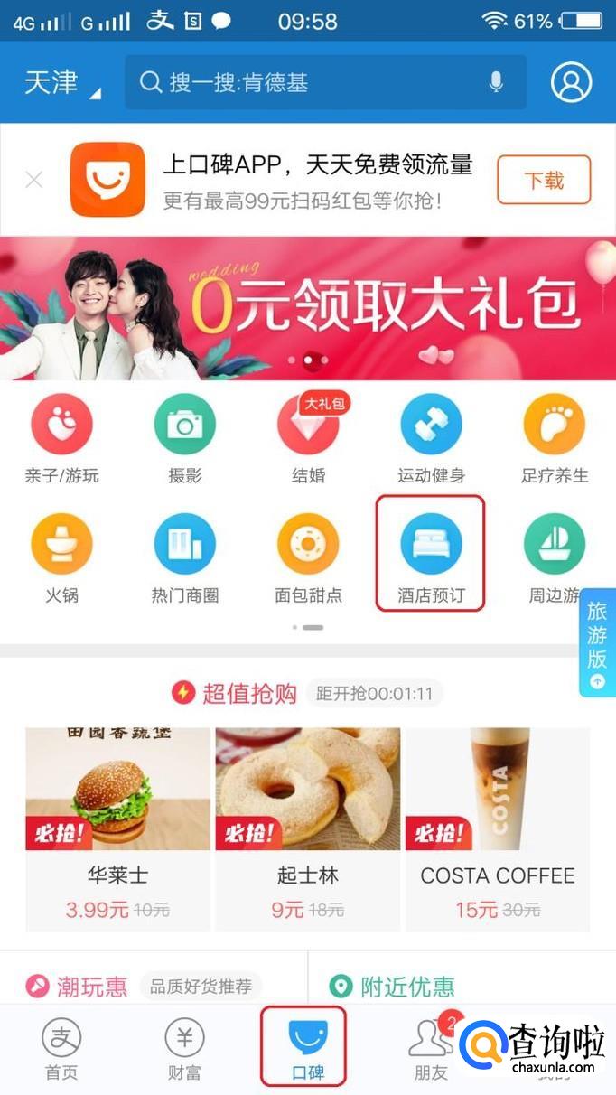 打开支付宝之后,点击底部“口碑”(或者下载“口碑”app之后打开),就可以看见里面有很多生活服务内容了,比如ktv、电影票、酒店预定(酒店预定在第二页)。