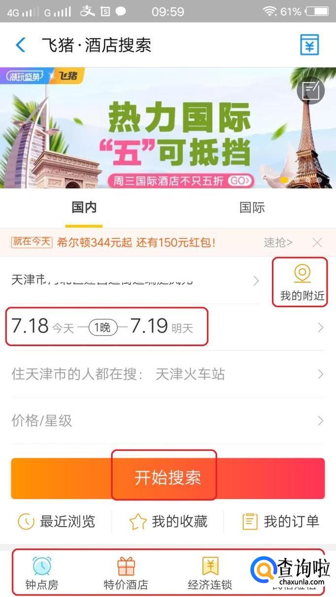 进入“飞猪酒店搜索”页面,点击图中“我的附近”,就会显示当前我的位置,然后选择入住时间,点击“开始搜索”。
