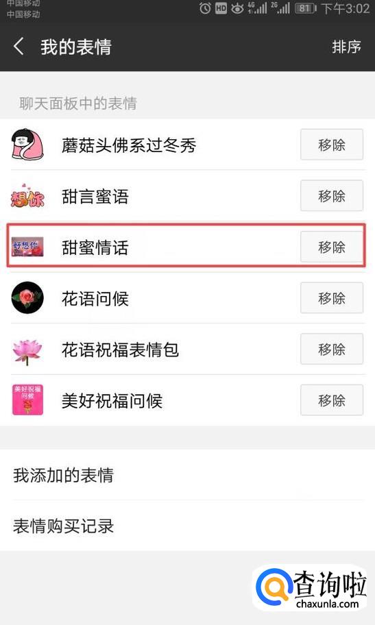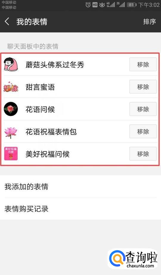 弹出的界面,我们就可以看到我们的表情包了,我们选中其中一个表情包,然后我们点击移除;