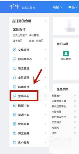 首先,淘宝卖家要登录“千牛”,点击进入“千牛”然后点击“营销中心”-再点击“我要推广”(还可以直接从淘宝营销中心进入我要推广)。