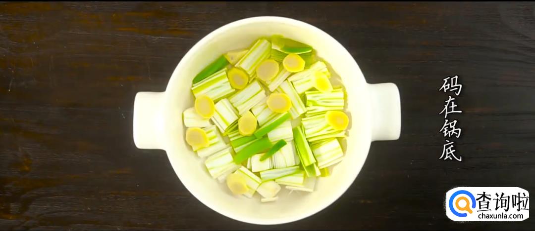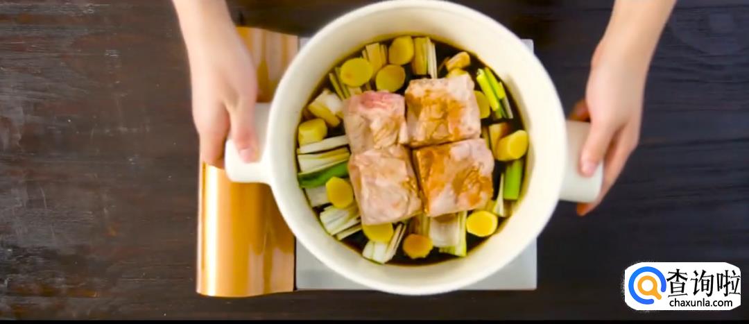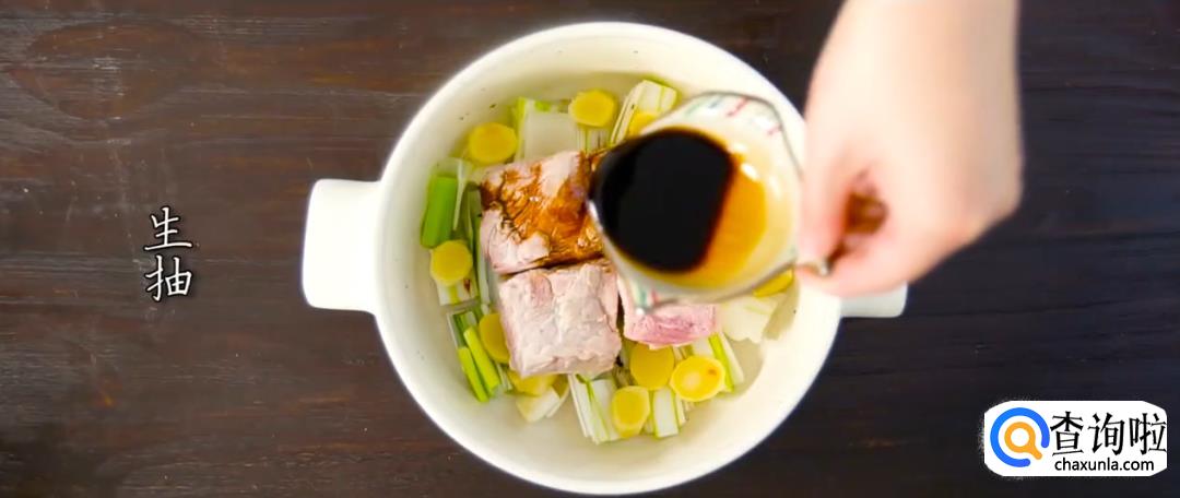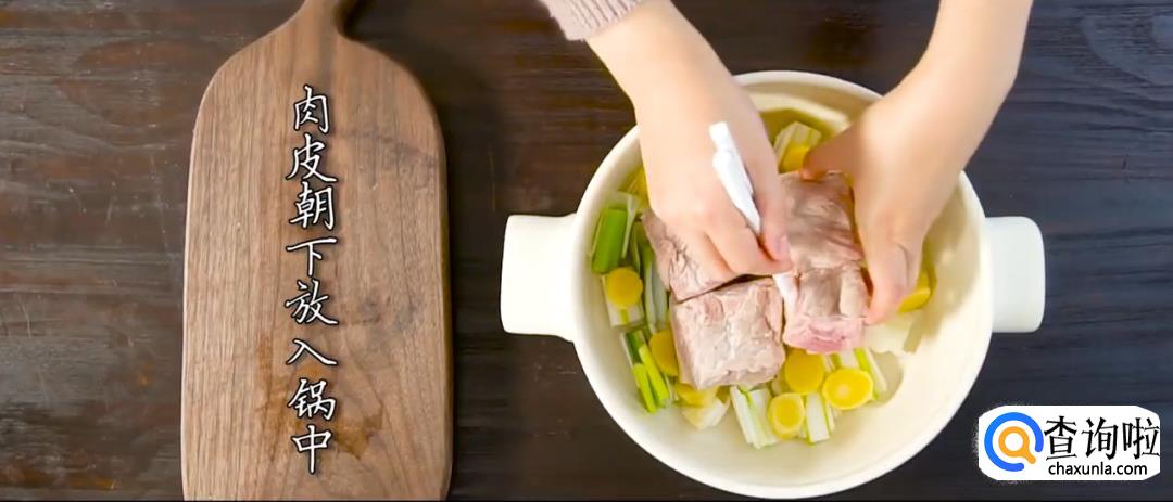 将葱段和姜片铺在炖锅锅底,将肉块皮朝下放入锅中,倒入老抽。