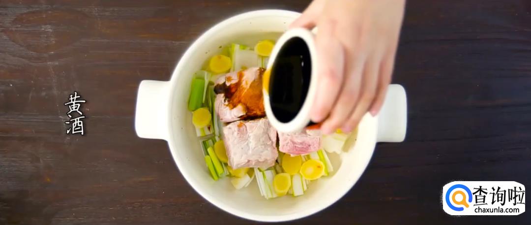 冷锅焯水,将整块肉放入水中,倒入黄酒,大火煮熟后捞出。