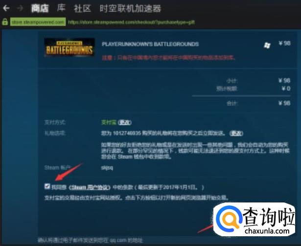推荐使用较快捷的支付宝和微信,这里以支付宝为例,勾选同意steam用户协议并点击“跳转至支付宝”。