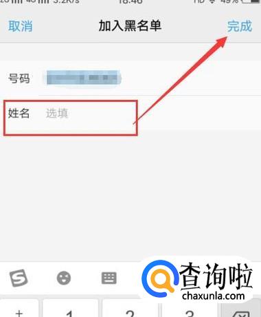 点击“加入黑名单”,进入下一页面,对黑名单电话备注姓名,点击完成即可,如图所示。