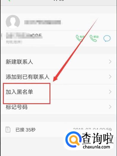 在电话详情页面,就可以看到“加入黑名单”选项,如图所示。