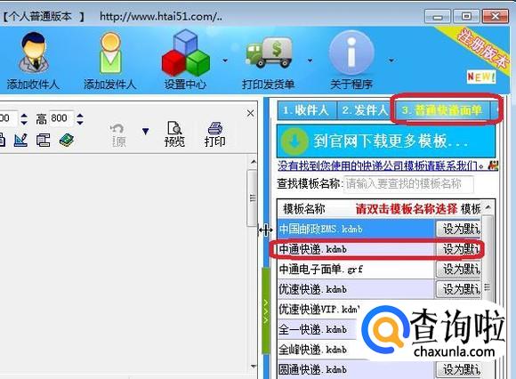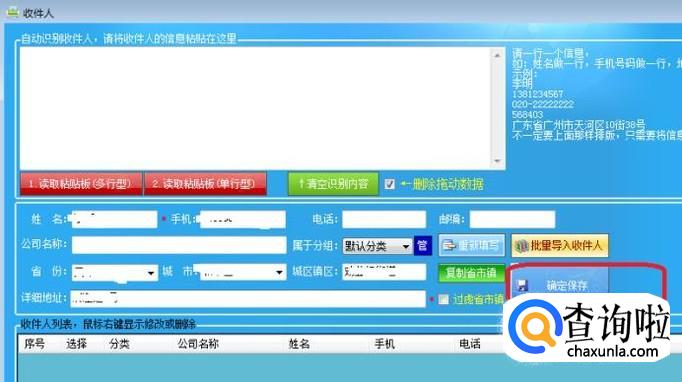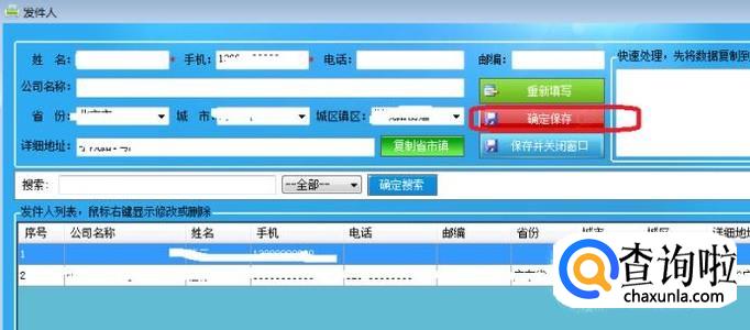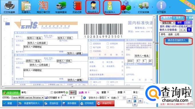 安装完成后,进入该软件界面,点击图中上部“添加收件人”、“添加发件人”按钮或者点击图中右侧添加收、发件人信息,分别点击“确定保存”保存信息。