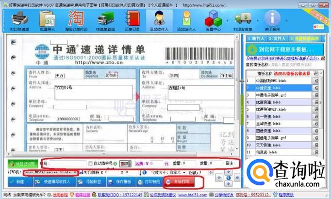 填写完善单号、运费等其他信息,设置打印机,点击“开始打印”就可以了。