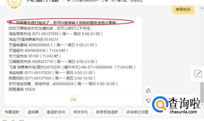 给小蜜发个信息【客服电话】,它就会给出一系列电话号码了,如下图所示: