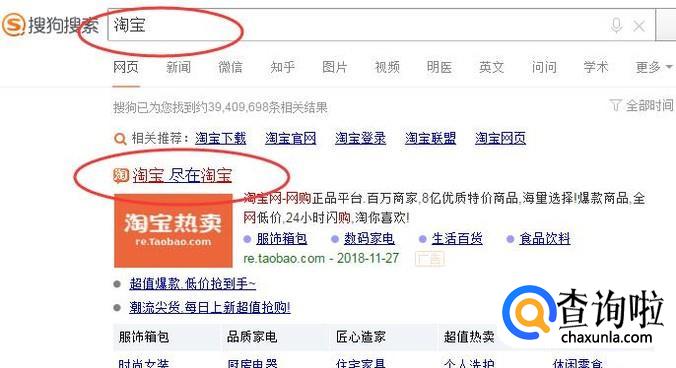 首先在浏览器中搜索【淘宝】,再点击第一条链接,如下图所示: